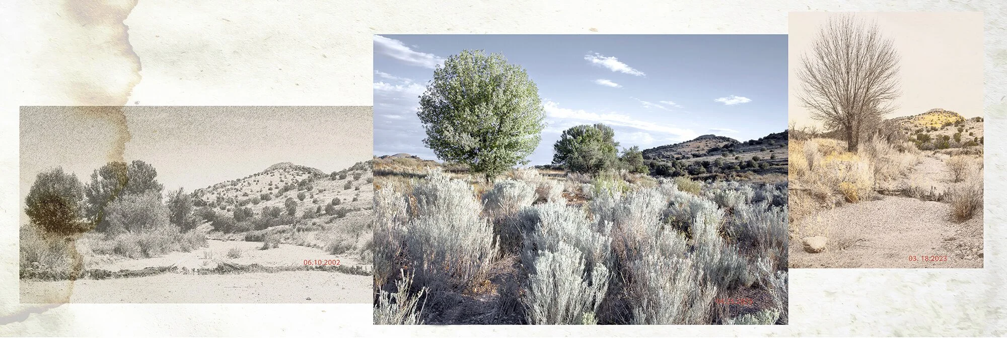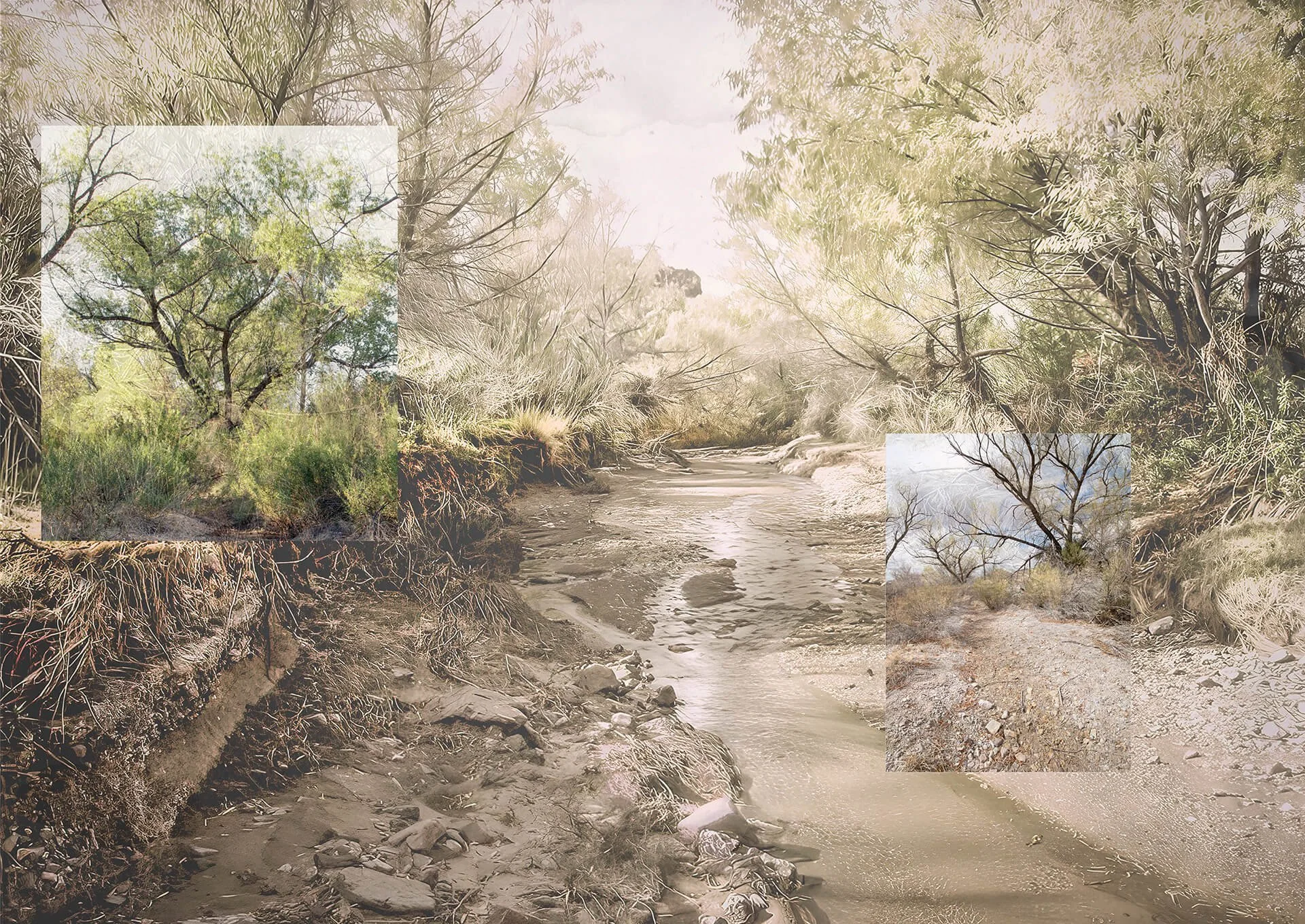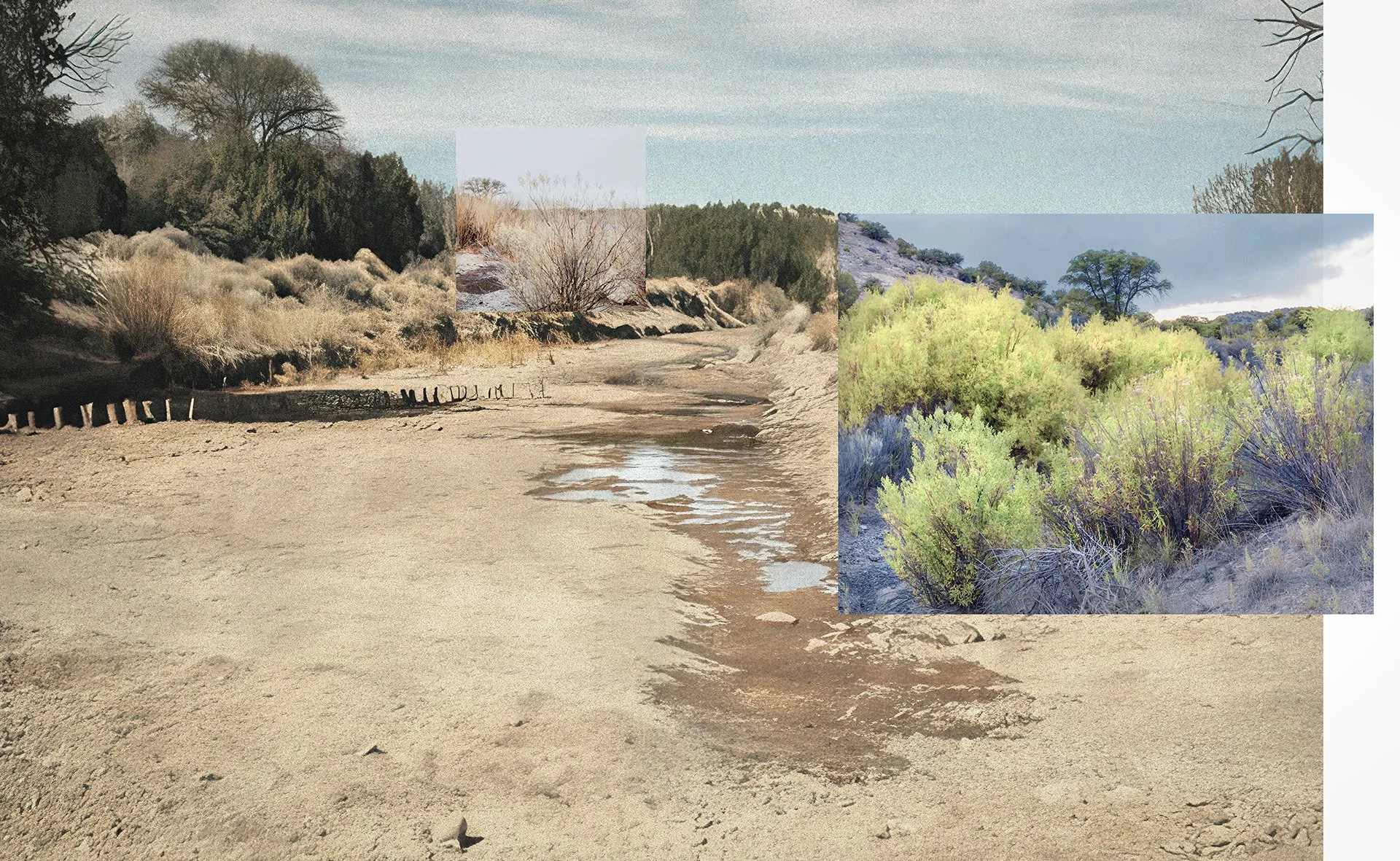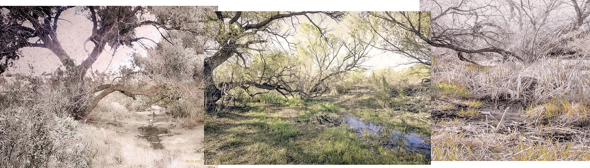 Three years ago, I met a couple who restored a nearly extinct spring-fed Ciénaga—a desert wetland unique to the Southwest— on their ranch, reversing a century of damage. They documented the land’s transformation with same-location photographs. I began collaging their pre-restoration images with my current ones, indicating dry past, a intermediate adaptation to more water and present abundance through layers and colors visualizing continuity, rupture, and transformation.